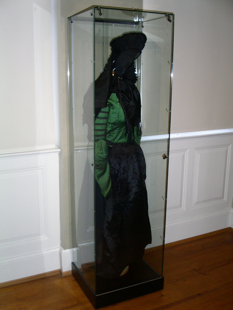 Für die Präsentation von besonderen Textilien kann man, wie es dieses Museum gemacht hat, auch eine Vitrine mit einer Schneiderpuppe bestücken.